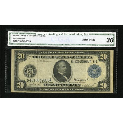 <B>Fr. 982 $20 1914 Federal Reserve Note CGA Very Fine 30.</B></I> A couple of pinholes are noted on this otherwise problem free issue.<BR><BR><b>Shipping:</b> Coins & Currency (<a target="_blank" href="http://www.heritageauctions.com/common/shipping.php">view shipping information</a>)