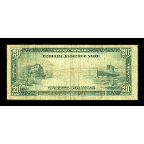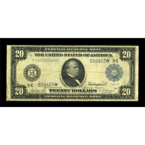 <B>Fr. 982 $20 1914 Federal Reserve Star Note Fine.</B></I> A very scarce $20 star which is new to the census for this number, which now totals just seven pieces known. This is an evenly circulated example which is problem free for the grade. <BR><I>From The Lawrence O'Neal Collection</B></I><BR><BR><b>Shipping:</b> Coins & Currency (<a target="_blank" href="http://www.heritageauctions.com/common/shipping.php">view shipping information</a>)