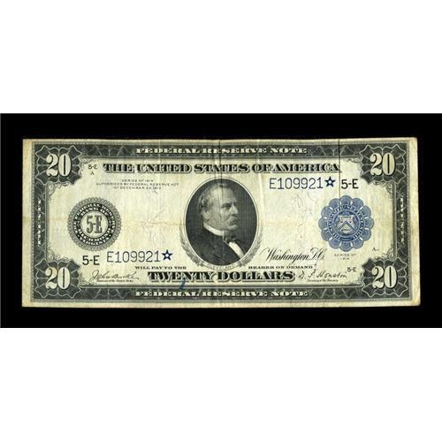 <B>Fr. 982 $20 1914 Federal Reserve Star Note Very Fine.</B></I> This discovery piece brings the total of known Stars for this issue to five and according to the census it rivals one other for finest known. The paper is solid and bright for a moderately circulated piece. There is however a lone ink mark hidden in the details of the face design.<BR><BR><b>Shipping:</b> Coins & Currency (<a target="_blank" href="http://www.heritageauctions.com/common/shipping.php">view shipping information</a>)