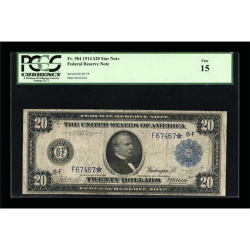 <B>Fr. 984 $20 1914 Federal Reserve Star Note PCGS Fine 15.</B></I> This original piece is evenly circulated and problem-free. Until this year, this piece has been tightly held in a collection since we last sold it in 1997.<BR><BR><b>Shipping:</b> Coins & Currency (<a target="_blank" href="http://www.heritageauctions.com/common/shipping.php">view shipping information</a>)