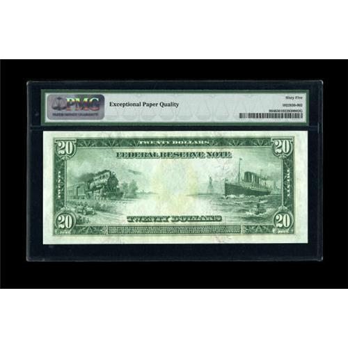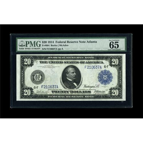 <B>Fr. 984 $20 1914 Federal Reserve Note PMG Gem Uncirculated 65 EPQ.</B></I> Pleasing margins are noticed on this Atlanta example, which is one of the nicest notes for this Friedberg number we have seen in some time. The majority of these notes were dispersed over ten years ago from a run sold by CAA.<BR><BR><b>Shipping:</b> Coins & Currency (<a target="_blank" href="http://www.heritageauctions.com/common/shipping.php">view shipping information</a>)