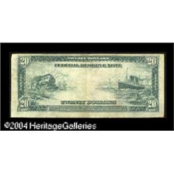 Fr. 984 $20 1914 Federal Reserve Star Note Fine. One of <B>Fr. 984 $20 1914 Federal Reserve Star Note Fine.</B></I> One of only nine notes known to Murray, a solid, problem-free piece. <BR><BR><B>Important notice:</B> Heritage usually auctions material at the rate of 200-250 lots per hour. On some occasions eBay Live bid software or the Internet may not be able to keep up with the pace of the auction. We recommend placing a realistic absentee bid now as insurance to avoid disappointment. Occasionally the auctioneer may eliminate or reject an eBay Live bid, and the auctioneer may also reopen a lot after the close of the eBay live bidding (usually because we missed an audience bid), and may reject your bid even if it shows you as the winning bidder. By bidding via eBay Live, you agree that Heritage may award the lot to another bidder at its sole discretion under the circumstances described above or any other reasonable circumstances. Since eBay bids are not shown to us until we open the lot on the floor, we treat those bids just like floor bids. In most cases the floor responds before the eBay bid is presented to us, due to Internet lag time, so for consistency we have made it a policy that floor bids are always considered first over tie eBay live bids. Also please note that all Heritage lots purchased through eBay Live carry a 20% Buyer's Premium. Please make sure you read the Terms and Conditions before you bid. This lot is being auctioned in conjunction with a live floor auction by Heritage Galleries & Auctioneers. All final auction and invoice information will be supplied by Heritage Galleries & Auctioneers, and all other information should be considered preliminary. Lot:17741
