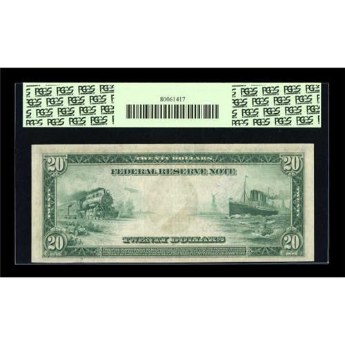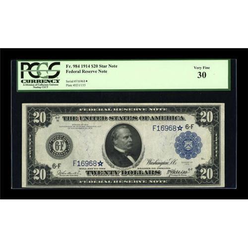 <B>Fr. 984 $20 1914 Federal Reserve Star Note PCGS Very Fine 30.</B></I> A high grade example which is one of eleven $20 Atlanta district Burke-McAdoo stars reported to date. This attractive note is far nicer than most from here and appears very conservatively graded.<BR><I>From The Lawrence O'Neal Collection</B></I><BR><BR><b>Shipping:</b> Coins & Currency (<a target="_blank" href="http://www.heritageauctions.com/common/shipping.php">view shipping information</a>)