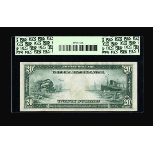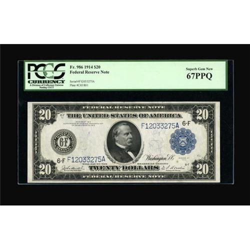<B>Fr. 986 $20 1914 Federal Reserve Note PCGS Superb Gem New 67PPQ.</B></I> To date, no other Superb Gem third party graded examples of this Atlanta District issue have made auction appearances. It is likely that this is the finest known piece from a small run of CU notes. The margins are solid and the paper especially bright.<BR><BR><b>Shipping:</b> Coins & Currency (<a target="_blank" href="http://www.heritageauctions.com/common/shipping.php">view shipping information</a>)