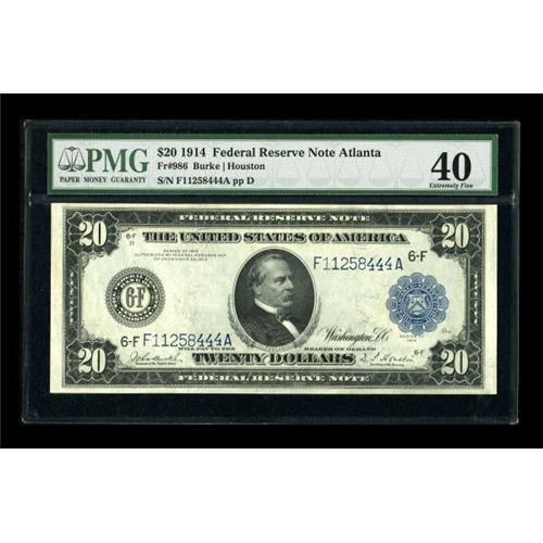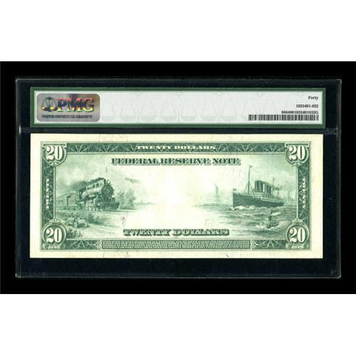 <B>Fr. 986 $20 1914 Federal Reserve Note PMG Extremely Fine 40.</B></I> This embossed $20 is nicely centered.<BR><BR><b>Shipping:</b> Coins & Currency (<a target="_blank" href="http://www.heritageauctions.com/common/shipping.php">view shipping information</a>)