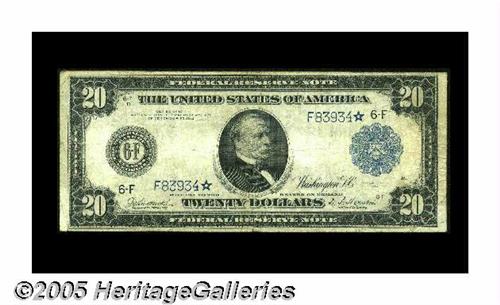 <B>Fr. 986 $20 1914 Federal Reserve Star Note Fine.</B></I> One of just four stars reported for this Friedberg number in the census. <I>From the collection of Richard Merlau.</B></I>