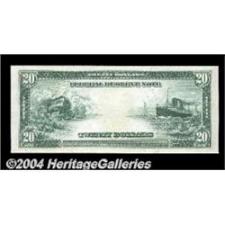 Fr. 987a $20 1914 Federal Reserve Note Superb Gem New. An incredible-quality note, with broad even margins, deep original embossing, ideal colors of the paper and inks and tremendous overall eye appeal. It's also a rather rare note; CAA has sold only six other examples, and the total census is under 20. Very likely the finest known of this number. <BR><BR><B>Important notice:</B> Heritage usually auctions material at the rate of 200-250 lots per hour. On some occasions eBay Live bid software or the Internet may not be able to keep up with the pace of the auction. We recommend placing a realistic absentee bid now as insurance to avoid disappointment. Occasionally the auctioneer may eliminate or reject an eBay Live bid, and the auctioneer may also reopen a lot after the close of the eBay live bidding (usually because we missed an audience bid), and may reject your bid even if it shows you as the winning bidder. By bidding via eBay Live, you agree that Heritage may award the lot to another bidder at its sole discretion under the circumstances described above or any other reasonable circumstances. Since eBay bids are not shown to us until we open the lot on the floor, we treat those bids just like floor bids. In most cases the floor responds before the eBay bid is presented to us, due to Internet lag time, so for consistency we have made it a policy that floor bids are always considered first over tie eBay live bids. Also please note that all Heritage lots purchased through eBay Live carry a 20% Buyer's Premium. Please make sure you read the Terms and Conditions before you bid. <BR><BR><B>IMPORTANT ANNOUNCEMENT ABOUT RESERVES:</B> Heritage now divulges all reserves on its web site 7 days before every auction. If you want to know whether the reserve on this lot has been met, and if not, what the reserve amount is, please visit this lot page on the HeritageCoin.com web site, or email: bid@HeritageGalleries.com