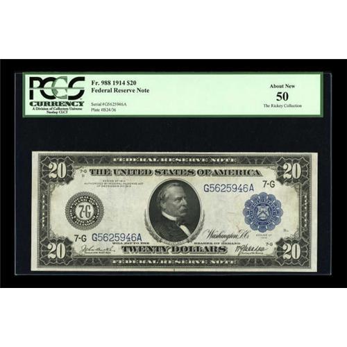 <B>Fr. 988 $20 1914 Federal Reserve Note PCGS About New 50.</B></I> This FRN denomination is showing renewed interest amongst the new generation of collectors. <BR><BR><b>Shipping:</b> Coins & Currency (<a target="_blank" href="http://www.heritageauctions.com/common/shipping.php">view shipping information</a>)