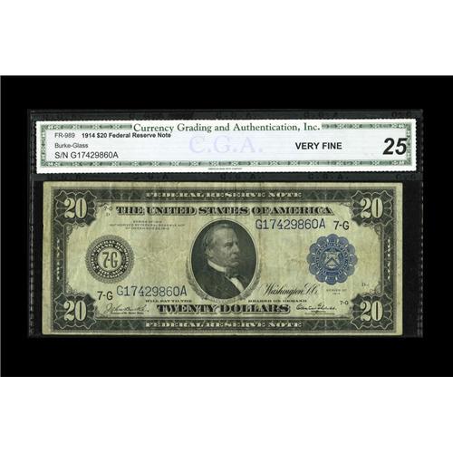 Fr. 989 $20 1914 Federal Reserve Note CGA Very Fine 25. Fr. 989 $20 1914 Federal Reserve Note CGA Ve