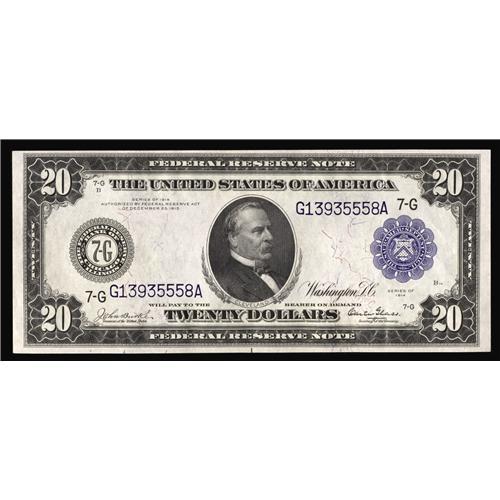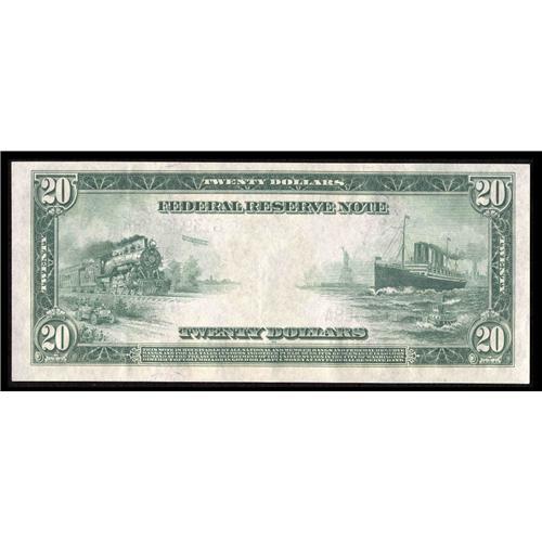 <B>Fr. 989 $20 1914 Federal Reserve Note Choice New.</B></I> A mere 29 examples of this Friedberg number are known in currency circles, and this is perhaps in the top five of those surviving examples. The upper margin is a little tight, but it is sufficient, and the paper and color are both exceptional.
