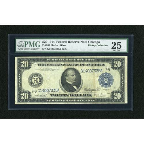 <B>Fr. 989 $20 1914 Federal Reserve Note PMG Very Fine 25.</B></I> The Burke-Glass signature combination is noted on this problem free piece.<BR><BR><b>Shipping:</b> Coins & Currency (<a target="_blank" href="http://www.heritageauctions.com/common/shipping.php">view shipping information</a>)