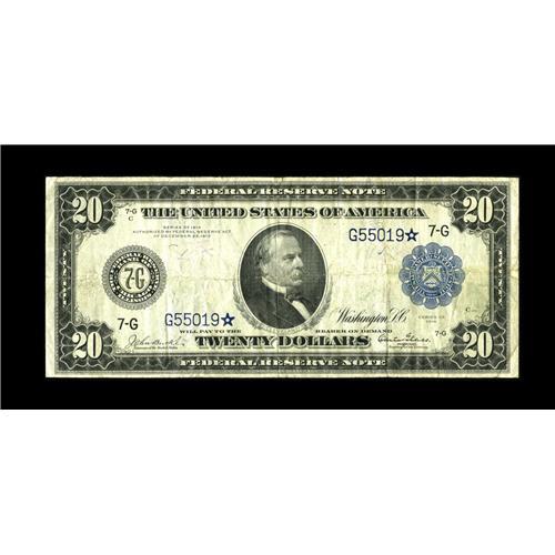 <B>Fr. 989 $20 1914 Federal Reserve Star Note Fine-Very Fine.</B></I> This piece is one of just five Chicago district Burke-Glass $20 stars listed in the census, and one which made its last appearance on the market back in 1981 when our consignor purchased it. The last appearance of any example was back in 1996, giving collectors an idea of just how tough this note truly is to find.<BR><I>Ex: Doug Murray</B></I><BR><BR><b>Shipping:</b> Coin/Currency (<a target="_blank" href="http://www.heritageauctions.com/common/shipping.php">view shipping information</a>)
