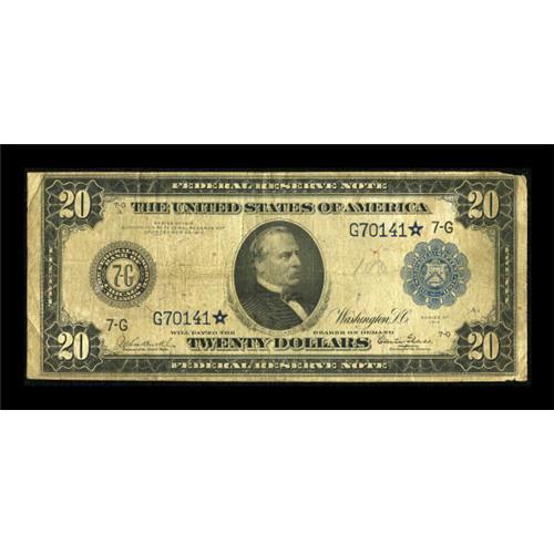 <B>Fr. 989 $20 1914 Federal Reserve Star Note Very Good-Fine.</B></I> This Chicago district Burke-Glass note is new to the census, which now totals just six pieces. Most have been off the market for many years; Track and Price notes just one auction offering for this number since 1996.<BR><I>From The Lawrence O'Neal Collection</B></I><BR><BR><b>Shipping:</b> Coins & Currency (<a target="_blank" href="http://www.heritageauctions.com/common/shipping.php">view shipping information</a>)