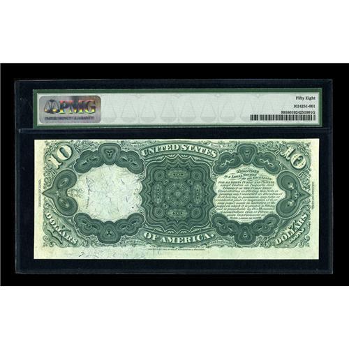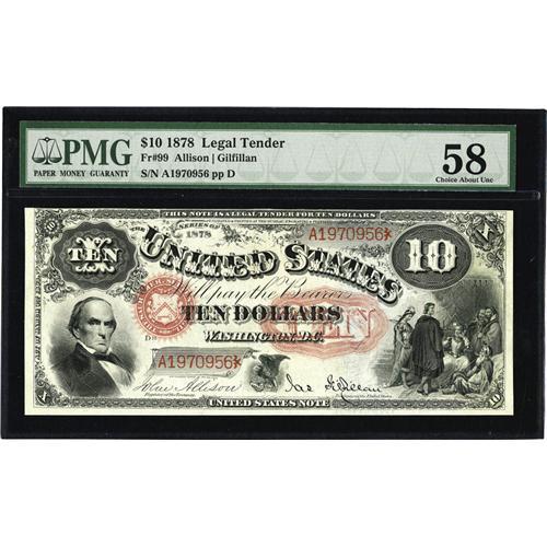 <B>Fr. 99 $10 1878 Legal Tender PMG Choice About Unc 58.</B></I> This is a somewhat more elusive type that is quite vibrant, but cut a shade tight at the top.