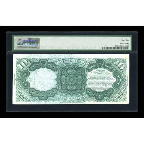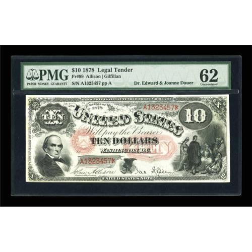 <B>Fr. 99 $10 1878 Legal Tender PMG Uncirculated 62.</B></I> Only about 75 examples of this number are known. This piece, which is illustrated both sides in the Dauers' reference work, was acquired by them from a 1996 CAA sale where it realized the then strong price of $1,320. The note has the very heavy accumulation of silk fibers that is associated primarily with this Friedberg number. The Dauers have used this piece to illustrate those fibers as well as for the illustration piece for the intricacy of the back design. They have also used this particular note to produce an enlargement of the vignette of John Smith presenting Pocahontas to Queen Elizabeth I. All in all, this very note is in seven illustrations on pages 84 and 85. <BR><I>From The Dr. Edward & Joanne Dauer Collection</B></I><BR><BR><b>Shipping:</b> Coins & Currency (<a target="_blank" href="http://www.heritageauctions.com/common/shipping.php">view shipping information</a>)