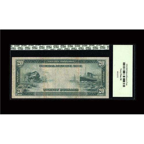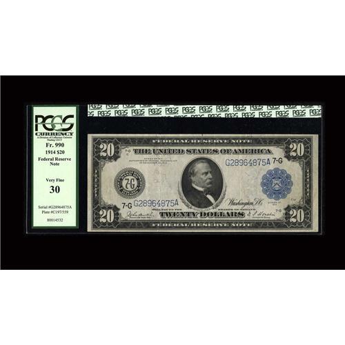 <B>Fr. 990 $20 1914 Federal Reserve Note PCGS Very Fine 30.</B></I> This broadly margined issue is free of distractions and is still fully bright.