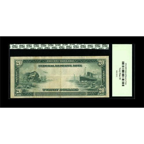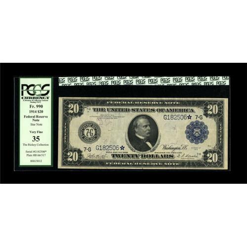 <B>Fr. 990 $20 1914 Federal Reserve Star Note PCGS Very Fine 35.</B></I> This star has the highest grade in the census for this Friedberg number. <BR><BR><b>Shipping:</b> Coins & Currency (<a target="_blank" href="http://www.heritageauctions.com/common/shipping.php">view shipping information</a>)