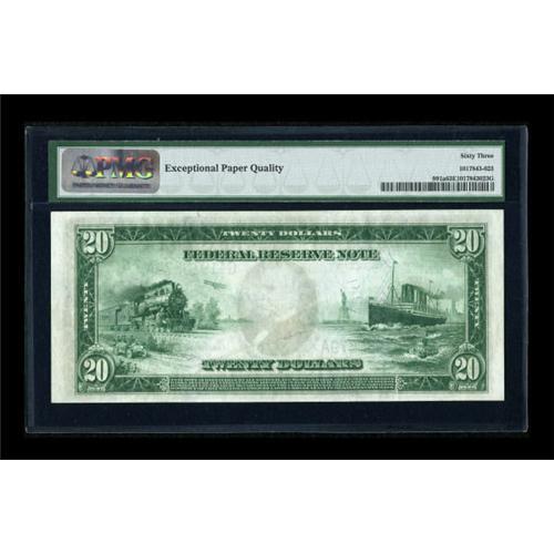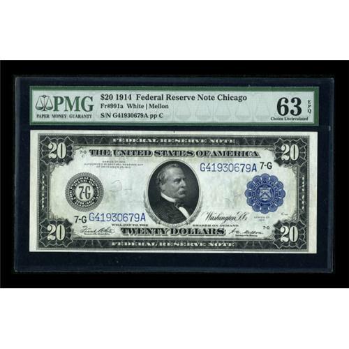 <B>Fr. 991a $20 1914 Federal Reserve Note PMG Choice Uncirculated 63 EPQ.</B></I> There are only five notes in the census for this Friedberg number that have been graded higher. The embossing and natural paper wave are easily viewed through the third-party holder.<BR><BR><b>Shipping:</b> Coins & Currency (<a target="_blank" href="http://www.heritageauctions.com/common/shipping.php">view shipping information</a>)