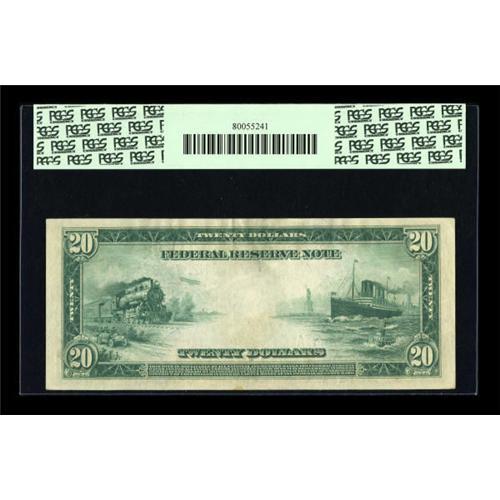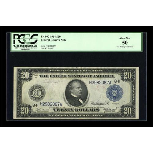 <B>Fr. 992 $20 1914 Federal Reserve Note PCGS About New 50.</B></I> This note is consecutive to the previous lot and it also has natural paper wave and embossing. <BR><BR><b>Shipping:</b> Coins & Currency (<a target="_blank" href="http://www.heritageauctions.com/common/shipping.php">view shipping information</a>)