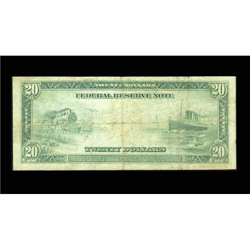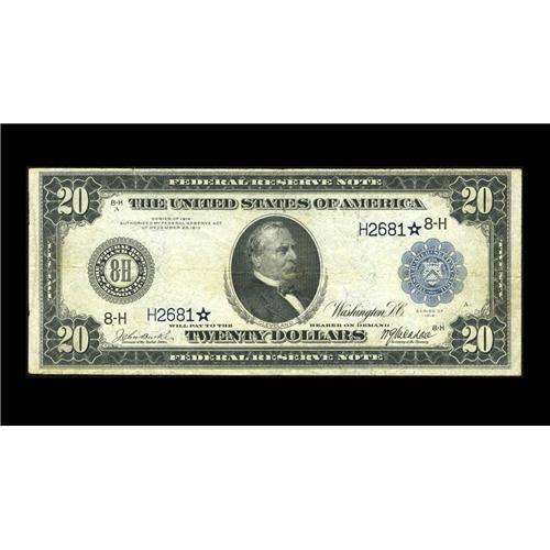 <B>Fr. 992 $20 1914 Federal Reserve Note Star Fine+.</B></I> This note, from the Merlau holdings, bears the lowest serial number for any $20 St. Louis district star, and is one of the nicest known for this number as well.<BR><I>From the Large Size Star Note Collection of Richard Merlau</B></I>