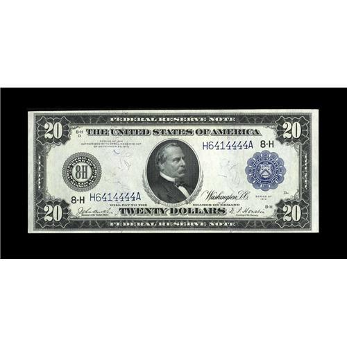<B>Fr. 994 $20 1914 Federal Reserve Note Choice About New.</B></I> A broadly margined example that has the eye appeal of a Gem note. There is a hint of a center bend. Recent discoveries have increased the number of known pieces to 41, but fewer than half of those have ever been offered at auction.<BR><BR><b>Shipping:</b> Coin/Currency (<a target="_blank" href="http://www.heritageauctions.com/common/shipping.php">view shipping information</a>)