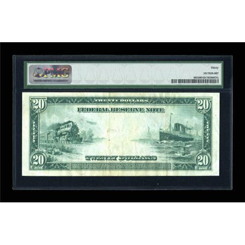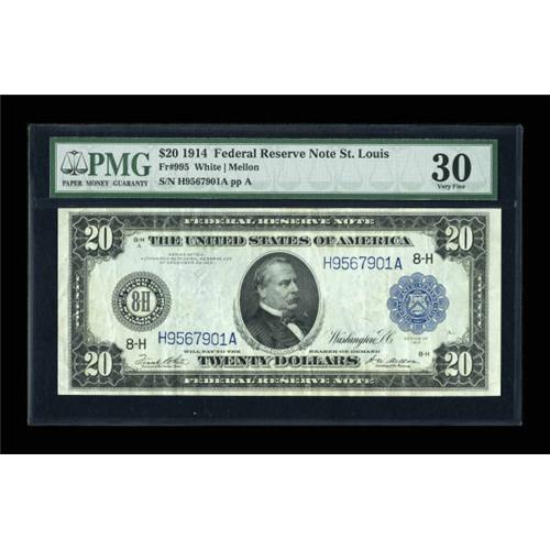 <B>Fr. 995 $20 1914 Federal Reserve Note PMG Very Fine 30.</B></I> This colorful strongly embossed note hails from the St. Louis district.<BR><BR><b>Shipping:</b> Coins & Currency (<a target="_blank" href="http://www.heritageauctions.com/common/shipping.php">view shipping information</a>)