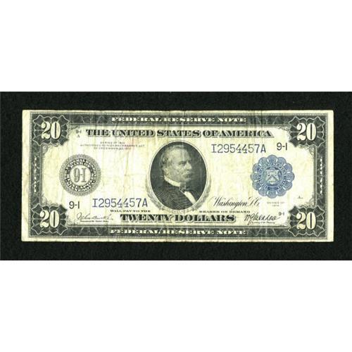 <B>Fr. 996 $20 1914 Federal Reserve Note Fine.</B></I> This Minneapolis $20 has natural paper surfaces. A little over 40 serial numbers have been recorded.<BR><BR><b>Shipping:</b> Coins & Currency (<a target="_blank" href="http://www.heritageauctions.com/common/shipping.php">view shipping information</a>)