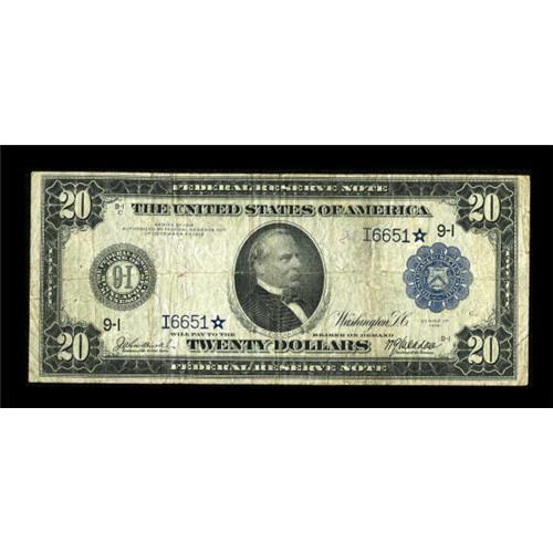 <B>Fr. 996 $20 1914 Federal Reserve Star Note Fine.</B></I> One of five Fr. 996 stars known, one of which is damaged. We have never had any example of this number to offer in any of our sales dating back to 1990. Expect to see some stiff competition before this Minneapolis star finds a new owner this evening. <BR><I>From The Lawrence O'Neal Collection</B></I><BR><BR><b>Shipping:</b> Coins & Currency (<a target="_blank" href="http://www.heritageauctions.com/common/shipping.php">view shipping information</a>)