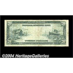 Fr. 998 $20 1914 Federal Reserve Note Fine. Mid range for rarity, with the census in the 40's. <BR><BR><B>Important notice:</B> Heritage usually auctions material at the rate of 200-250 lots per hour. On some occasions eBay Live bid software or the Internet may not be able to keep up with the pace of the auction. We recommend placing a realistic absentee bid now as insurance to avoid disappointment. Occasionally the auctioneer may eliminate or reject an eBay Live bid, and the auctioneer may also reopen a lot after the close of the eBay live bidding (usually because we missed an audience bid), and may reject your bid even if it shows you as the winning bidder. By bidding via eBay Live, you agree that Heritage may award the lot to another bidder at its sole discretion under the circumstances described above or any other reasonable circumstances. Since eBay bids are not shown to us until we open the lot on the floor, we treat those bids just like floor bids. In most cases the floor responds before the eBay bid is presented to us, due to Internet lag time, so for consistency we have made it a policy that floor bids are always considered first over tie eBay live bids. Also please note that all Heritage lots purchased through eBay Live carry a 20% Buyer's Premium. Please make sure you read the Terms and Conditions before you bid. <BR><BR><B>IMPORTANT ANNOUNCEMENT ABOUT RESERVES:</B> Heritage now divulges all reserves on its web site 7 days before every auction. If you want to know whether the reserve on this lot has been met, and if not, what the reserve amount is, please visit this lot page on the HeritageCoin.com web site, or email: bid@HeritageGalleries.com