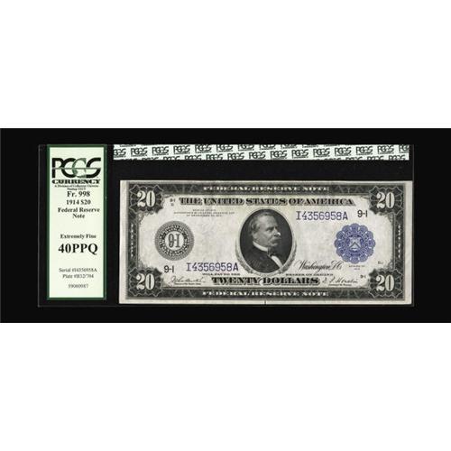 <B>Fr. 998 $20 1914 Federal Reserve Note PCGS Extremely Fine 40PPQ.</B></I> Natural paper surfaces and embossing claim this Minneapolis $20.