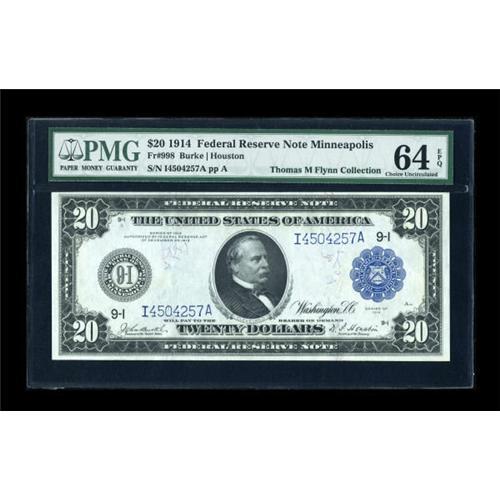 <B>Fr. 998 $20 1914 Federal Reserve Note PMG Choice Uncirculated 64 EPQ.</B></I> Surprisingly common for the Minneapolis District with considerably over 100 pieces known. This one has "Exceptional Paper Quality" to go along with its 64 grade. <BR><I>From The Thomas M. Flynn Collection</B></I><BR><BR><b>Shipping:</b> Coins & Currency (<a target="_blank" href="http://www.heritageauctions.com/common/shipping.php">view shipping information</a>)