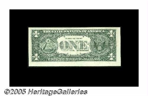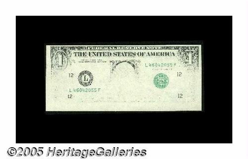 <B>Fr. ????-L $1 Federal Reserve Note. Choice Crisp Uncirculated.</B></I> A roughly 75% missing first face printing, actually far scarcer than a totally absent first printing.