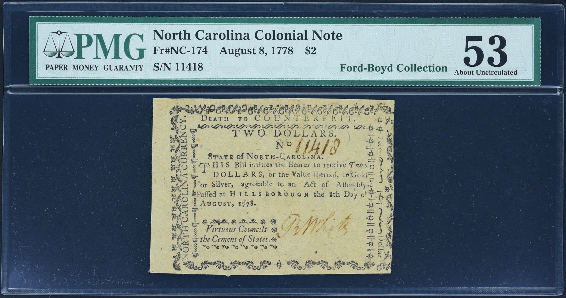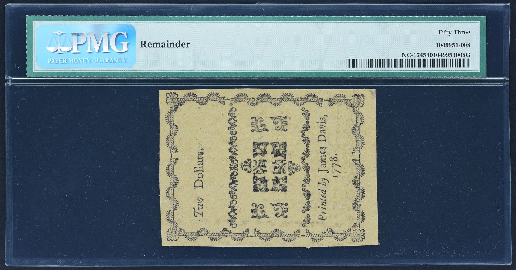Title: Fr. NC-174 North Carolina August 8, 1778 $2 PMG About Uncirculated 53 remainder