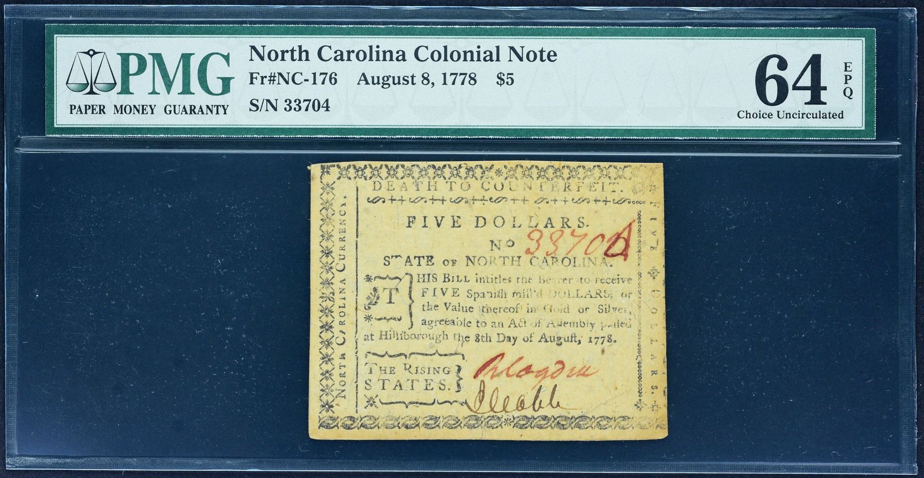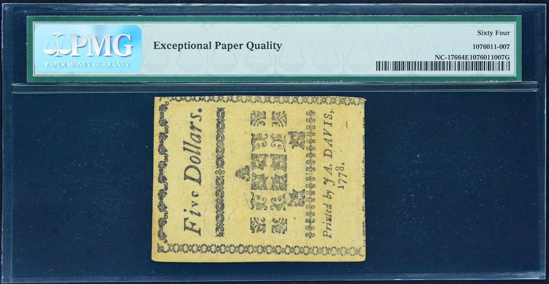 Fr. NC-176d North Carolina August 8, 1778 $5 PMG Choice Uncirculated 64 EPQ