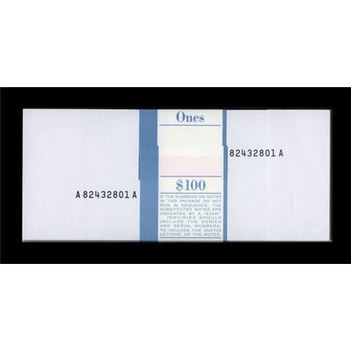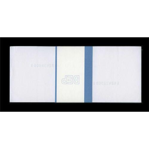 <B>Fr. ? Pack of 100. Experimental German Printing.</B></I><BR> A consecutively numbered pack of 100 notes, each printed on plain white bond paper and banded with a BEP $100 "ones" band, and each numbered with what certainly appears to be a normal U.S. currency font serial number. These notes were obtained in Europe, and were allegedly printed as a test using one of the German designed presses which the Bureau of Engraving and Printing was evaluating for purchase some years ago. We have seen no other such items for sale and have no earthly idea of value here, but we would be quite surprised if $50 or more per note was not a base per piece price for this unusual and fascinating item. <BR><BR><b>Shipping:</b> Coins & Currency (<a target="_blank" href="http://www.heritageauctions.com/common/shipping.php">view shipping information</a>)