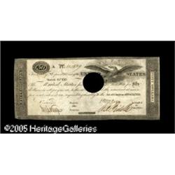 <B>Fr. TN-11a $50 March 15, 1815 "Act of February 24, 1815" Treasury Note Choice Crisp Uncirculated, HC.</B></I> All signed examples of this Friedberg number have been hole cancelled, with this being a charming example that is signed by F.W. McGeary and C.C. Biddle, with a countersignature of Joseph Nourse. A partial hammer cut cancel was laid down first, before the hole cancel was applied, leaving remnants of the hammer cancel behind at the edges of the hole cancel. Lot:16726