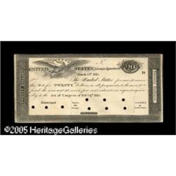 <B>Fr. TN-12 $20 March 25, 1815 "Act of February 24, 1815" Treasury Note Extremely Fine-About Uncirculated, PC.</B></I> This plate letter D note is the note credited in Friedberg as only one note known. However, the plate note in <I>U.S. Essay, Proof and Specimen Notes</B></I> by Gene Hessler sports plate letter E. Both of these are finished proofs, while the October 2004 Ford sale contained an incomplete proof that lacked the denomination near the left-hand edge. The example presented here has been punch cancelled with nine small holes along the signature lines. Also, the back upper left-hand corner exhibits three creases. Lot:16727