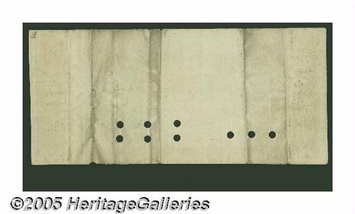 <B>Fr. TN-12 Hessler X83D $20 March 25, 1815 "Act of February 24, 1815" Treasury Note Very Fine, PC.</B></I> This India paper plate letter B proof is mounted on thick paper, and traces its lineage through Boyd and Ford, as most all of the 1812 Treasury Notes in this extraordinary collection. This incomplete proof is lacking only the engraved left-end "Twenty Dollars" designation, and there are nine punch cancels along the signature lines. A couple of small patches of foxing, plus several vertical folds are noticed on the actual proof, while the backing has acquired some extra soiling and a few edge nicks. Still, between the statistics of Don Kagin, Gene Hessler, and the John J. Ford Collection, only three proofs can be accounted for.