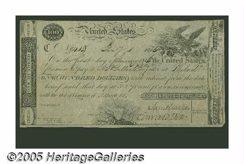 <B>Fr. TN-6 Hessler X74C $100 Act of March 4, 1814 Treasury Note Extremely Fine.</B></I> This plate letter C remainder is signed by Saml. Clarke and Edward Fox, lacking only the Commissioner of Loans signature. A lateral center fold, a lateral fold with two tines a little below the upper edge, and a vertical fold are noticed. The bottom half of the note shows light foxing, and the upper margin is mostly along the frame line, with the lower right-hand corner tip outside the frame line missing. Also, a couple of spots of trivial ink erosion are observed, but the emphasis of this note is its extreme rarity, with only three listed by the leading collectors and researchers in this field. You too can add your name to the Boyd, Ford, O'Neal provenance of this note that this auction now provides.