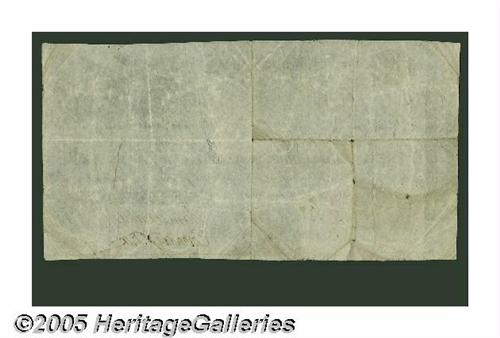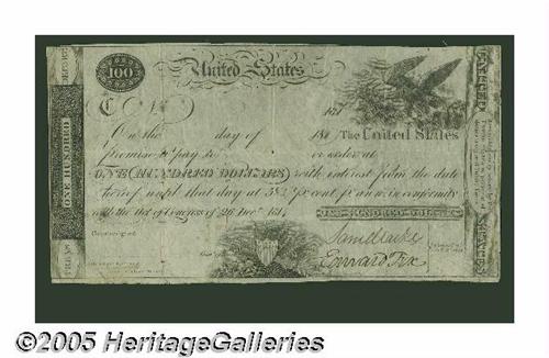 <B>Fr. TN-8a Hessler X80C $100 Act of December 26, 1814 Treasury Note Fine-Very Fine.</B></I> This ex-F.C.C. Boyd, Ford plate letter C specimen is one of only four documented for this Friedberg number. This remainder has two of the three signatures required, and those are of Saml. Clarke and Edward Fox. This note was carried by a proud owner, leaving a few small apertures mostly along the folds behind, and a patch of soiling. Also, the signature of Edward Fox shows some ink erosion. Still, a rare and desirable note from the second term of President James Madison, and worthy of a premium bid.