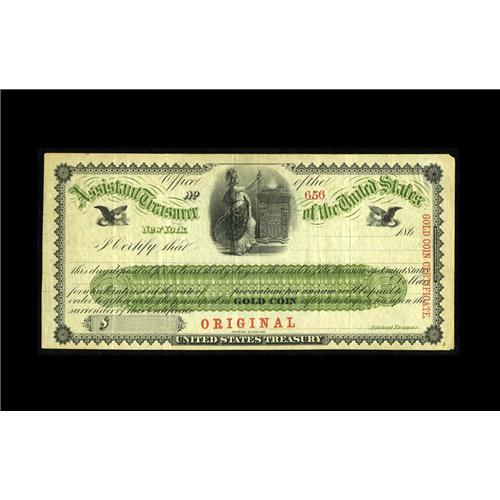 <B>Fr. UNL 186_ United States Treasury Assistant Treasurer of the United States at New York Gold Coin Certificate.</B></I> This is in the similar style of the two preceding lots, but it was a certificate for depositing gold coin for at least thirty days and receiving the principal plus interest when this certificate was surrendered. The amount of gold coin deposited would be hand-written in and these were a multiple part form. This <B>Very Fine</B></I> certificate was once possibly mounted, leaving behind a small hole in the upper right-hand corner. Two small black rectangles are also noticed on the back of this certificate. Another great opportunity to explore little known areas of American government finance.