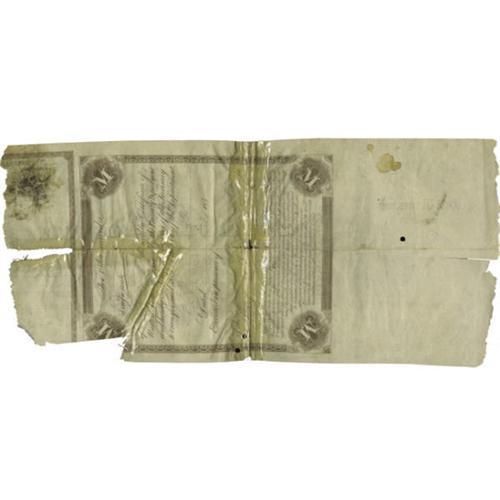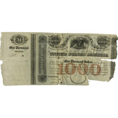 <B>Fr. UNL Hessler X116F $1000 Loan of 1847 Registered Bond Fine, PC.</B></I> This is a very rare bond with Hessler's highest rarity rating of R8, 1 to 3 known. These were authorized by the act of January 28, 1847. Small state arms medallions are intertwined at top along with denomination counters and an eagle vignette. This remainder has been punch cancelled and it still has its register stub. There are tape repairs on the back and pieces missing at right center and lower corner.<BR><BR><B>Coin Engraver:</B> probably Joseph Wright<BR><BR><b>Shipping:</b> Coins & Currency (<a target="_blank" href="http://www.heritageauctions.com/common/shipping.php">view shipping information</a>)