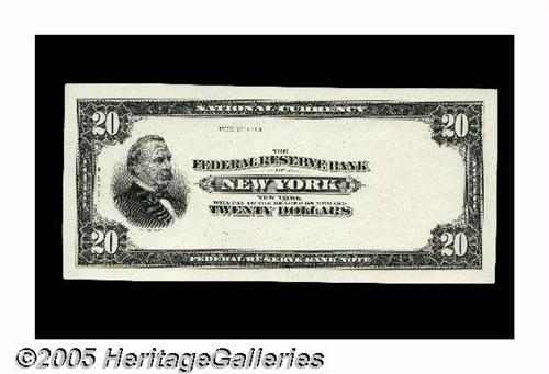 <B>Fr. Unlisted Hessler FRBE9 $20 191_ Federal Reserve Bank Note Proof Essay Gem New.</B></I><BR>This face proof essay is of the type for Friedberg 822-830, but it is for the unissued New York district. The major details have been completed on this black and white example, but it is missing various details, such as the full series date, the authorization act, engraved signatures, etc. It has also been printed directly on to card stock. FRBN proofs are definitely rare, and this one should draw much attention as it is on a district that did not issue any $20 FRBNs.