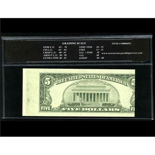 <B>Fr.l 1980-J $5 1988A Federal Reserve Note. RCGS Crisp CU 62.</B></I> The back printing is shifted dramatically to the right, leaving a huge left margin and a portion of the back cut off at the right. The face also displays a subtle green roller mark.