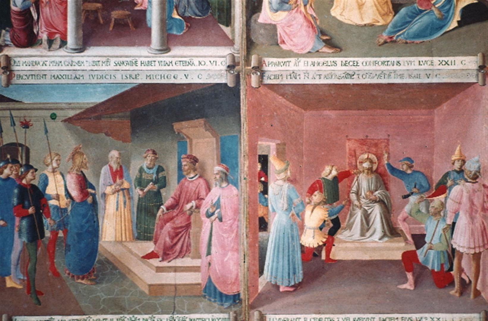 Artist: Fra Angelico - Title: Christ in Front of Pilate - Medium: Fine Art Giclee on Canvas - Image Size: Approximately 20 inches x 13.25 inches - Unframed on Unstretched Canvas - Biography: Fra Angelico (born Guido di Pietro; c. 1395 - February 18, 1455) was an Italian painter of the Early Renaissance, described by Vasari in his Lives of the Artists as having "a rare and perfect talent".He earned his reputation primarily for the series of frescoes he made for his own friary, San Marco, in Florence. In modern Italian he is called Beato Angelico (Blessed Angelic One); the common English name Fra Angelico means the "Angelic friar". In 1982, Pope John Paul II proclaimed his beatification in recognition of the holiness of his life, thereby making the title of "Blessed" official. He is listed in the Roman Martyrology as Beatus Ioannes Faesulanus, cognomento Angelicus--"Blessed Giovanni of Fiesole, surnamed 'the Angelic' ".