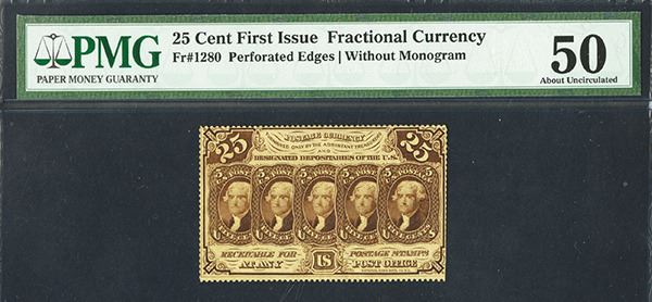 PMG graded About Uncirculated 50 with a 4mm internal stain or possibly ink mark on the back with one very light horizontal fold keeping this lovely note from Choice AU to Uncirculated. Attractive note.
