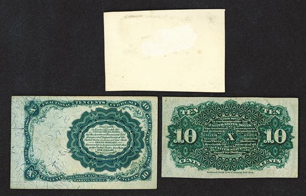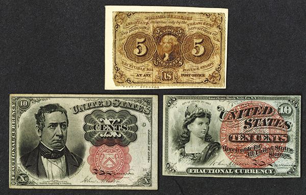 United States. First Issue 5 Cents, Fr. 1229 Very Good, mounted on top back to card stock; 10 Cents, Fr. 1258 Very Fine; 10 Cents, Fr. 1266 Short key. Very Fine +. 3 pieces.