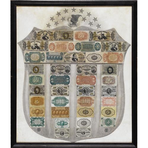 <B>Fractional Currency Shield, With Gray Background.</B></I> This Shield gives an overall impressive appearance. It does not suffer from the water staining so typical of these majestic numismatic items. The white backing is bright for a 140 year old item that has proudly been displayed during its lifetime. The Shield also looks like it is housed in a near-period frame. The brown paper back enclosure and hanging wire are probably of a more recent vintage. About half the notes show ink fading of different degrees and the penmanship on the hand-signed notes shows some fading, too. Nonetheless an attractive, pleasing Shield that is far better than most and ready to settle down in your den or study.<BR><BR><b>Shipping:</b> Coins & Currency (<a target="_blank" href="http://www.heritageauctions.com/common/shipping.php">view shipping information</a>)