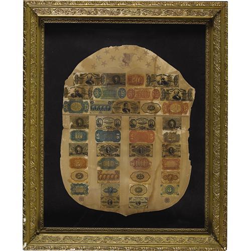 <B>Fractional Currency Shield, With Pink Background.</B></I> Far and away the worst Pink Shield this cataloger has ever seen, and it is likely the worst that exists. Were it not for the fact that we are playing favorites due to the consignor being a close friend, we would say bad things about this shield. Most of the notes are damaged, but some of the damage is difficult to see because of the stains. The shield has been cut out into the design all the way around, and the notes are aged, torn, stained, and generally repulsive. Nonetheless, this is a very rare Pink Shield. Only about 20 of these exist, and for condition, this piece is clearly in the top 25. The gold-leafed elaborate frame, although not perfect, is definitely the high point of this offering. Nice Pink Shields are worth about $20,000 on the current market. Assigning a value to this presently offered piece is a challenge that we will avoid. Offered without estimate.<BR><BR><b>Shipping:</b> Coins & Currency (<a target="_blank" href="http://www.heritageauctions.com/common/shipping.php">view shipping information</a>)