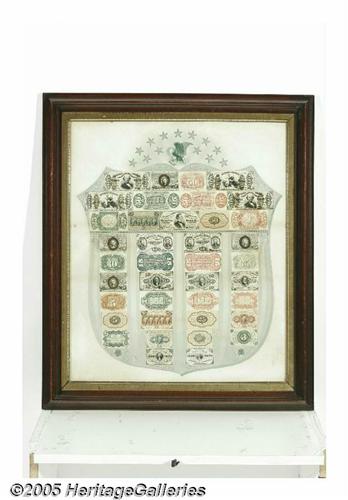 <B>Fractional Currency Shield, with Green Background.</B></I> To our best knowledge there are less than a dozen Green Shields in existence, and we have personally examined nine of them. This is the third finest that we've handled, with the Milt Friedberg example which we sold in January 1997 being the finest. The green background color on this Shield is as close to perfect as it gets, with all of the fine design elements clear and intact. The eagle and stars at the top of the Shield are as boldly green as the back of a large size note, without the slightest hint of fading. The great majority of the notes are nearly fully bright, with the exceptions being the 25¢ Second Issue back, which is always faded on Shields, and the 50¢ First Issue face and back notes, both of which have slightly aged paper. The Shield is fully wide on its original paper all the way out to the edges, and exhibits only very minor water staining at the bottom, which does not reach the Shield itself and is barely noticeable, even on the blank paper. It is housed in a period frame, with the inner surface gold leafed and the wide outer frame a dark hardwood. A spectacular item that is destined to wind up on the den or office wall of a serious fractional aficionado.